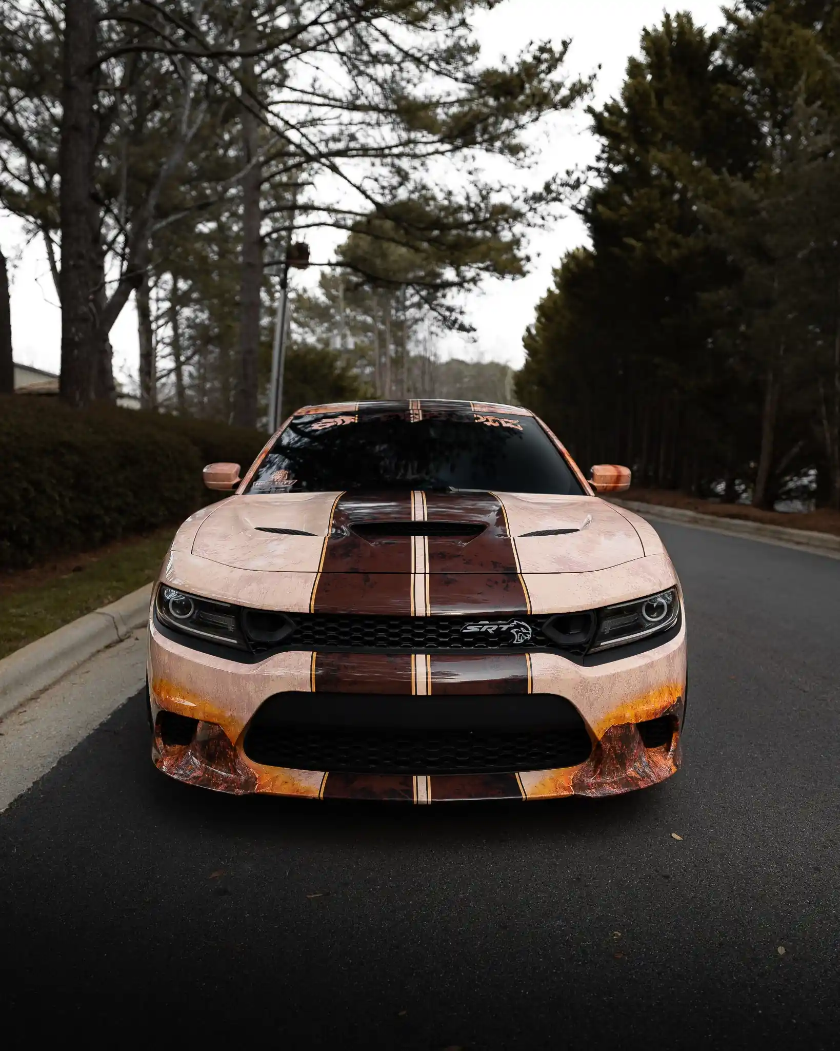 This Dodge Charger SRT Hellcat was wrapped with a one-off custom printed design that mixes a distressed copper/bronze texture with bold graphic elements for an unmistakable street-ready look. The build is tied together with a dark center stripe and fine pinstriping that runs clean and straight from the hood through the body, adding a race-inspired edge. We finished the rear quarters in a deep black to create contrast and make the artwork pop even harder against the tinted glass and black wheels. Every panel was carefully aligned and laid to keep the graphics seamless across body lines, edges, and high-visibility areas for a show-quality finish.